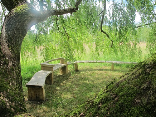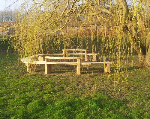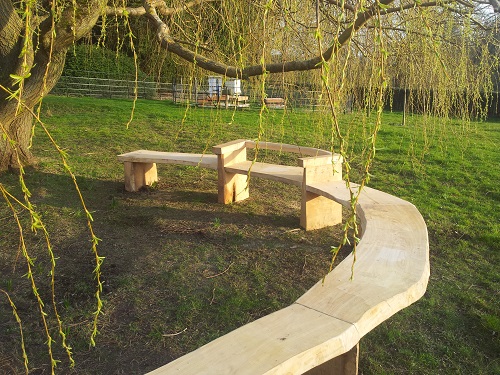We used curved pieces of sweet chestnut for the bespoke seats and sections of english oak for the legs. Both hardwoods are sustainably sourced. The semi circular bespoke bench was handcrafted next to a wonderful willow, led by the shape of the tree and undulating over the ground within a meadow. We also incorporated two seat back rests.